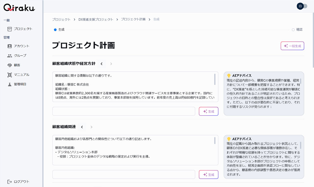 プロジェクト中に保存・生成された情報はQiraku内にナレッジとして蓄積され、次回以降のプロジェクトでの類似事例を活かしたアウトプット生成に必要なRAGを構築します。