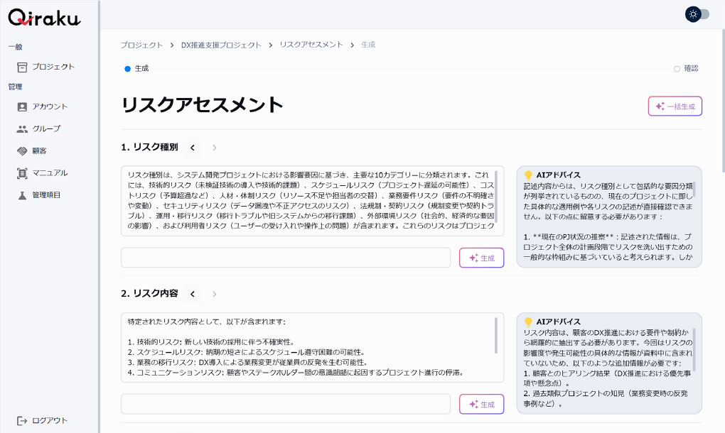 仕様変更等が発生した際は、情報を適宜Qirakuにアップ・登録することで、プロジェクト管理やリスクアセスメントの内容を再生成し、必要な対応を確認できます。