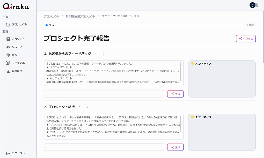 プロジェクト中に蓄積された情報を活用し、AIで報告書を手軽に生成いただけます。
